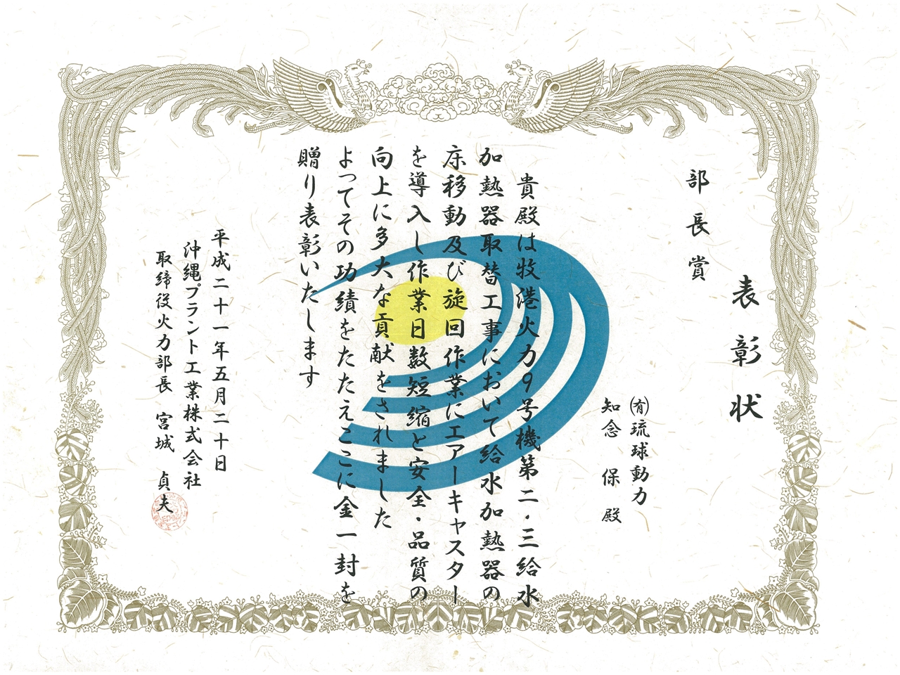 琉球動力が頂いた、表彰状や感謝状の一覧です。これからもお客様のご期待に応えるべく社員一同サービス向上に努めます。